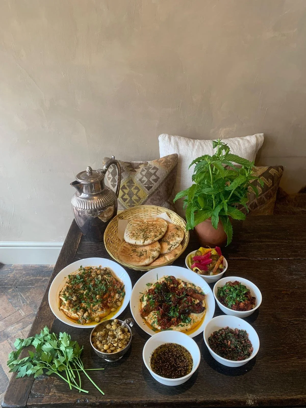 A hummus bar consists of a simple menu which usually contains rich slow braises, tangy, spicy sauces and tahina - all of which comes served inside a well of hummus. Once you've chosen your dishes, the meal is always served with array of hot, sweet and sour pickles, and chutneys as well incredibly fluffy pitta. All of these things are designed to be eaten together in every mouthful to create the perfect balance of flavours.